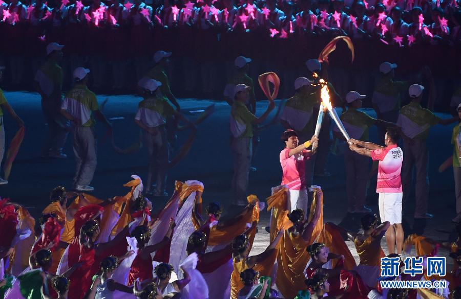 8月16日,第二届夏季青年奥林匹克运动会开幕式在南京奥林匹克中心举行。图为开幕式上火炬手、著名羽毛球运动员林丹(右)与火炬手、著名短道速滑运动员周洋交接火炬。 新华社记者燕雁摄