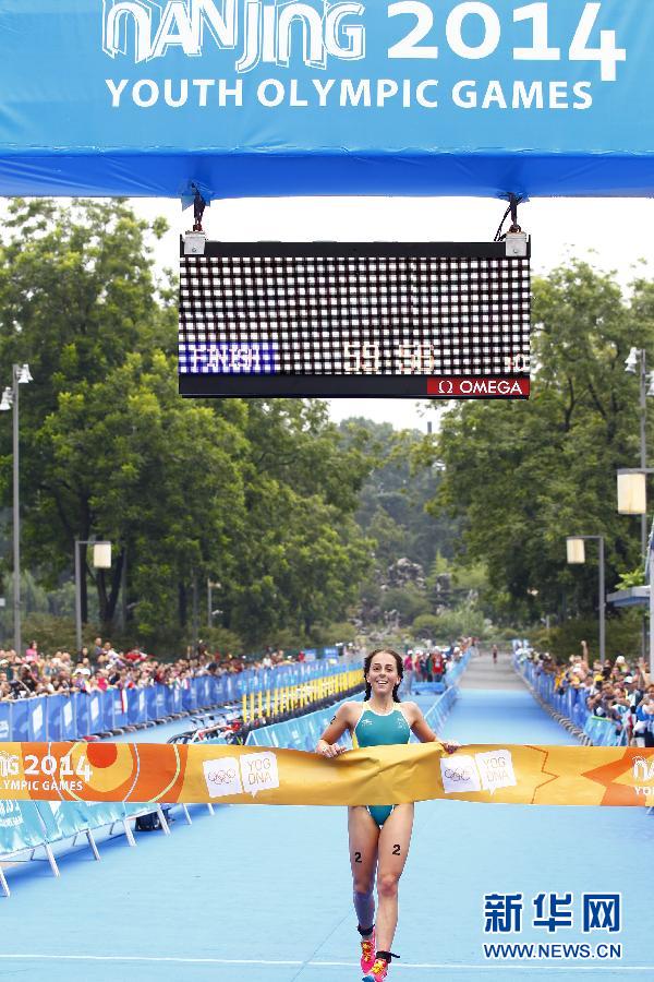 当日,在2014南京青奥会铁人三项女子决赛中,澳大利亚选手布里塔妮·达顿夺得冠军,这也是本届青奥会的首枚金牌。 新华社记者丁旭摄
