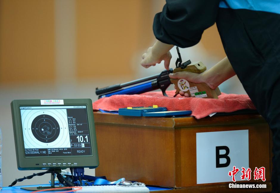 8月17日,第二届夏季青年奥运会女子10米气手枪比赛在方山体育训练基地举行决赛。图为印度选手在比赛中装填弹药。中新社发 侯宇 摄