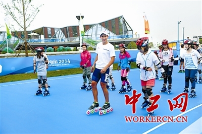 外国运动员教孩子们学轮滑。 中工网记者 郎成 摄