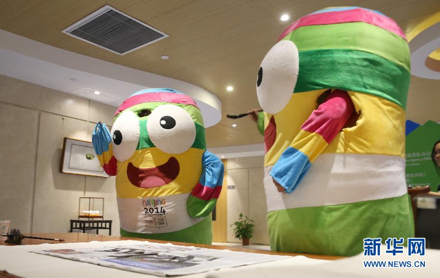 8月19日,南京青奥会吉祥物“砳砳”来到主新闻中心,在这里一展书法技艺。 新华社记者曹灿摄