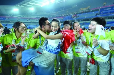南京青奥会上,志愿者的工作可谓细致入微。田径赛场上,829名志愿者辛苦工作多日,终于迎来了比赛落幕,休息的机会“姗姗来迟”。一场专门为他们安排的主题狂欢告别晚会,就在田径赛场举行。