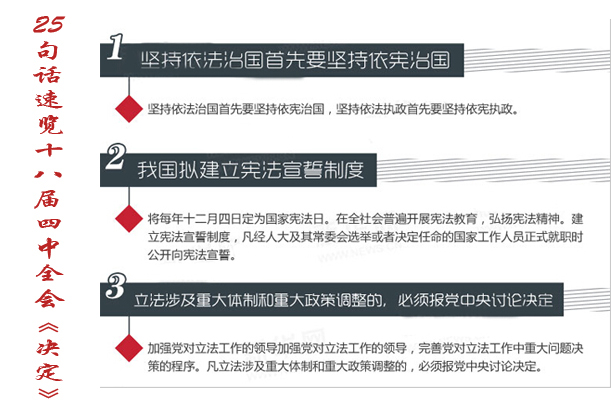 十八届四中全会审议通过的《中共中央关于全面推进依法治国若干重大问题的决定》提出,凡立法涉及重大体制和重大政策调整,须由党中央讨论决定,明确了中国共产党的领导是依法治国实施过程的重要保障。这次《决定》强调,要“依宪治国”......