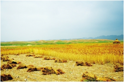 一望无边的平川里,没有河流。天空带着恒古未变的蓝色,静静地俯视着下面的奇特的田地:为了保住有限的水分不被蒸发,勤劳而智慧的父老在土地上面铺上了一层厚厚的砂石。砂地上,生长着一种叫做“和尚头”的麦子,同样为了适应这种缺水的环境,“和尚头”的麦穗没有长麦芒,只有一颗光秃秃的脑袋。它的麦穗和麦秆在成熟的时候呈现出一种焦渴的土黄色。就是在这砂石之地扎根长成的麦子,磨出的面粉以劲道闻名兰州城。连片的“和尚头”在干旱的秦王川里顽强而艰难地生长着,一年下来能否长足腰身颗粒饱满,完全仰赖于老天爷能够下几场透雨。记得小时候,每逢四五月间连着几日下大雨,大人们就呆在家里,听他们边喝茶水边说着:“这一次砂下透了。”语气里有一种日子终于有了着落的庆幸和踏实。孩子们则在屋檐下一边看雨水如粗线一般往早就摆放好的缸里淌,一边拍着手欢叫世代相传的童谣:“天爷天爷大大(地)下,蒸(哈)馍馍车轱辘大!”