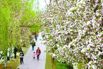 以往,海棠花花期约在4月中旬。如果不出意外,这个周末正好是海棠的盛开期。不过就在上周,也有不少心急的人跑到了公园里拍照赏花。沿着河边漫步,行走在含苞待放的花海之中,让人心旷神怡。如此美景,还引来了两只野鸭游嬉在绿波之中,给这里增添了勃勃生机。