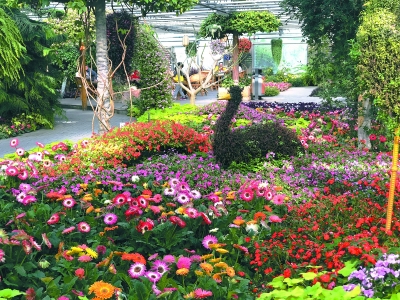 步入园区,热带植物馆隔着一泓游弋着数只天鹅的水潭映入眼帘。徜徉在热带植物馆内,浓郁的异域风情伴着热带独有的湿润气息扑面而来。这里有高大壮观、树龄近300年的澳洲“佛肚树”,有高12米,重1.6吨,树龄达400多年的重阳木,有第四世纪冰川留下的古老树种“红豆杉”,还有国家三级保护植物“龙血树”,以及来自加那利群岛的海枣,和来自海南的老人葵、蒲葵、面包树、木棉树等。这些来自世界各地的植物在这里奇妙地和谐共生,热情地展示着自己独有的风情和魅力。