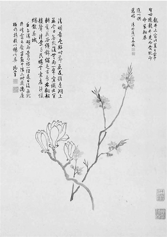 这上面画了两支交叠的小花,一为桃花一为玉兰,就挂在负一楼“为爱西湖”单元的小角落里,看上去并不起眼。马晟楠说,因为更希望大家看到一个有个人情感的乾隆。