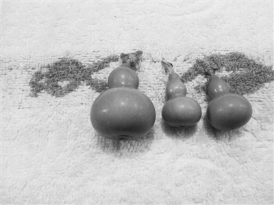 石先生的葫芦从大到小,应有尽有,种类齐全。其中他最钟情的还是小巧玲珑的葫芦,这种葫芦只有硬币大小。通常适合于把玩的葫芦的尺寸应在3厘米以下。据行家介绍,他们把玩的葫芦大多是美国品种,与中国品种相比,它最大的特点是尺寸非常小,能够满足盘葫芦的要求。
