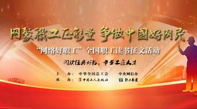 全总为更好地鼓励广大职工多读书、读好书,提升职业能力,涵养工匠精神,淬炼人生品格,于2017年8月21日---2017年9月26日开展“网聚职工正能量 争做中国好网民”系列活动之“网络好职工”全国职工读书征文活动。