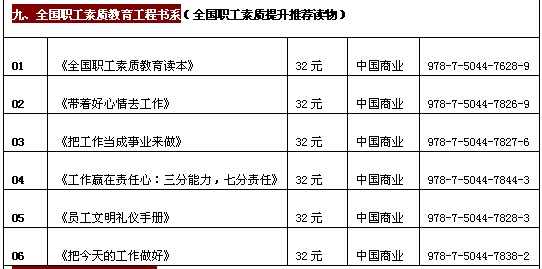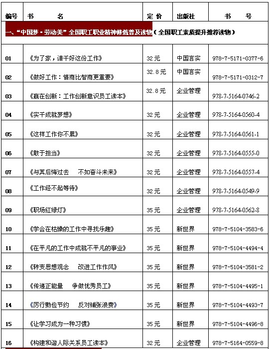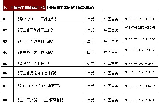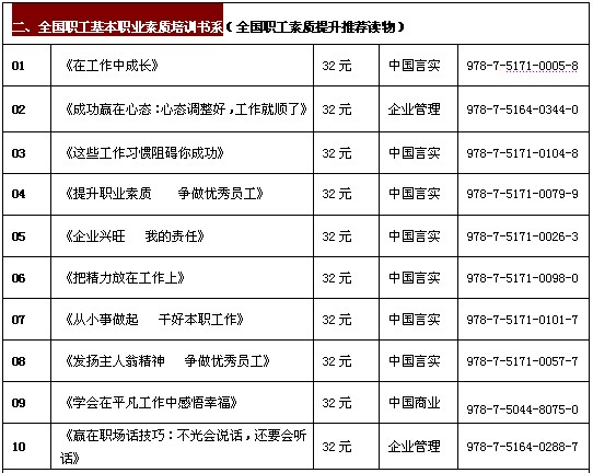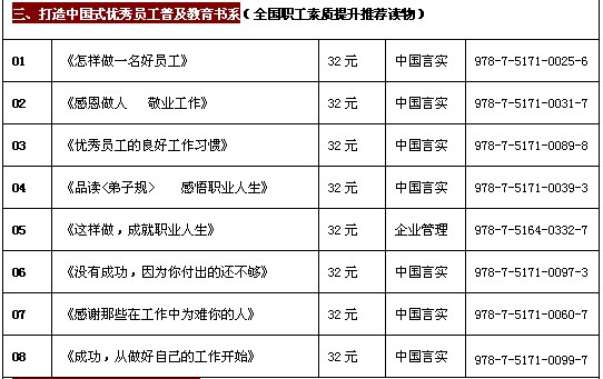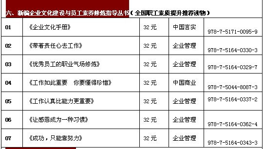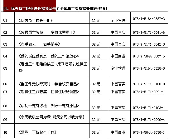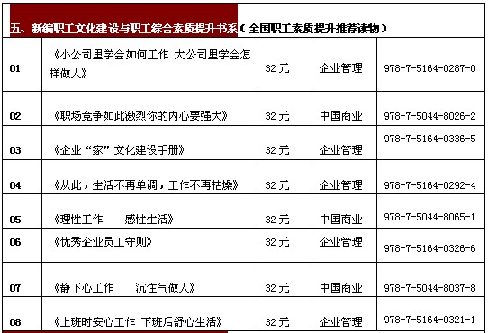 (职场、素质教育、员工培训、企业班组、职业安全与健康、企业文化、职工文化、员工书屋、工会类等图书)