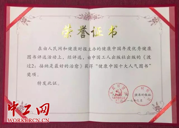中工网讯 2017年3月17日下午,由人民日报社人民网、健康时报主办的第十届健康中国论坛(2017)健康图书主题论坛暨2016年度优秀健康图书评选发布会在北京举行。中国工人出版社《渡过2:接纳是最好的治愈》获得“健康中国年度十大健康图书”“健康中国十大人气图书”荣誉称号,这是社会对于抑郁症的关注,也是对抑郁症患者的鼓励和支持。