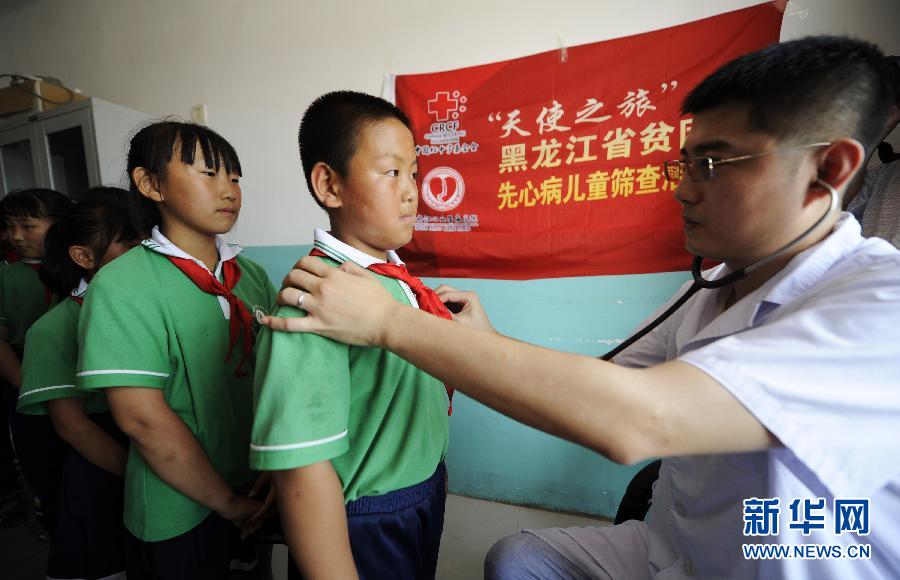 6月24日,牡丹江心血管病医院的医务人员在齐齐哈尔市龙江县人民医院对当地儿童进行义诊。当日,中国红十字基金会“天使之旅”黑龙江省贫困先天性心脏病儿童筛查活动在黑龙江省齐齐哈尔市龙江县启动。中国红十字基金会将携医疗专家团队在黑龙江省龙江县、甘南县、泰来县开展先心病儿童的筛查与治疗行动。据悉,“天使之旅”先心病儿童筛查活动自2011年开展以来,先后前往青海、西藏、内蒙古、云南等贫困边远地区,目前已累计资助5000余名先心病患儿进行手术治疗。新华社记者 刘勇贞 摄 6月24日,牡丹江心血管病医院的医务人员在齐齐哈尔市龙江县人民医院对当地儿童进行义诊。当日,中国红十字基金会“天使之旅”黑龙江省贫困先天性心脏病儿童筛查活动在黑龙江省齐齐哈尔市龙江县启动。中国红十字基金会将携医疗专家团队在黑龙江省龙江县、甘南县、泰来县开展先心病儿童的筛查与治疗行动。据悉,“天使之旅”先心病儿童筛查活动自2011年开展以来,先后前往青海、西藏、内蒙古、云南等贫困边远地区,目前已累计资助5000余名先心病患儿进行手术治疗。新华社记者 刘勇贞 摄 6月24日,牡丹江心血管病医院的医务人员在齐齐哈尔市龙江县七棵树镇对该镇中心小学的学生进行义诊。当日,中国红十字基金会“天使之旅”黑龙江省贫困先天性心脏病儿童筛查活动在黑龙江省齐齐哈尔市龙江县启动。中国红十字基金会将携医疗专家团队在黑龙江省龙江县、甘南县、泰来县开展先心病儿童的筛查与治疗行动。据悉,“天使之旅”先心病儿童筛查活动自2011年开展以来,先后前往青海、西藏、内蒙古、云南等贫困边远地区,目前已累计资助5000余名先心病患儿进行手术治疗。新华社记者 刘勇贞 摄