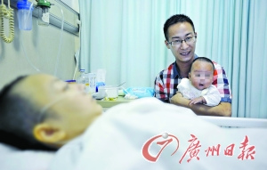 小飞扬与爸爸守护在妈妈身边,他的名字是爸爸起的,其中的“飞”字,与妈妈的“菲”字是谐音。 广州日报记者邱伟荣摄 妻子车祸昏迷,可能成为植物人,但丈夫始终坚持守护。他相信,上天一定是听到了他的心声。三天后,她在昏迷中剖腹生下儿子;两个半月后,她醒了;三个月后,她开口说出了第一句话;四个月后,她可以跟他吵架了…… 文/广州日报记者黄蓉芳 “小菲,飞扬是谁呀?” 6月25日下午3:00,在广州医科大学附属第三医院神经外科的病房里,27岁的湖北小伙小宇,将脸贴近躺在病床上的妻子小菲,柔声问道。小菲立刻答道:“我儿子!”声音里竟有几分调皮。 尽管她的眼睛还不能准确地跟他对视,但他的嘴角,已经扬起一丝骄傲的微笑。他说,如果时间回到4个月前,她哪怕能够看他一眼,他也愿意用生命去交换。