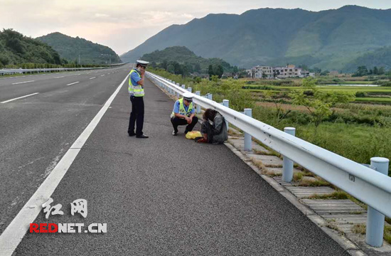 交警询问流浪人员情况。 在等待交警过来的过程中,刘先生又从车上拿来食物和水给流浪汉,并不停询问流浪汉的身体状况。 接到刘先生报警后,临武县交警大队的两名高速交警赶到了现场,交警初步询问得知,该男子是一名流浪人员,因不慎误入高速公路,一时又找不到出口,饥困交加的他便选择了睡在高速公路上。为避免这名流浪人员发生意外,交警用警车将该男子护送出高速公路。 “类似事件我们每个月都要处理几起,刘先生这次出于对高速公路交通安全整体的考虑,出于对流浪汉个人安全的考虑,宁愿放弃自己的行程,耽误自己的时间,及时报警,值得提倡和表扬。”处理此事的交警说。 与刘先生同行的朋友肖先生在自己的微信朋友圈发布了与刘先生一起守护流浪人员,等待其被救援的过程,朋友们纷纷留言点赞。刘先生表示,自己今天只是去会友,不怕耽误时间,生命第一。
