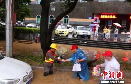 钢丝善行团成员向在水中抢修的抗台风一线人员发放馅饼和水。 尚钢 摄