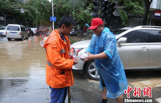 志愿者们向战斗在抗台风一线的工作人员发放馅饼和水。 尚钢 摄