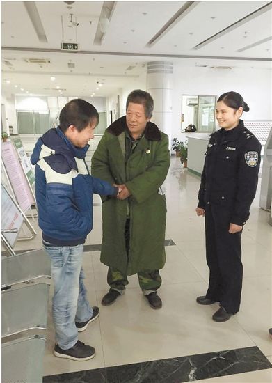 “兄弟见面”穿绿色大衣的就是张国成(中),左一为王立新。 22年前去广东谋生,下车后却发现钱被偷了,流落街头的他,差点走上歧路