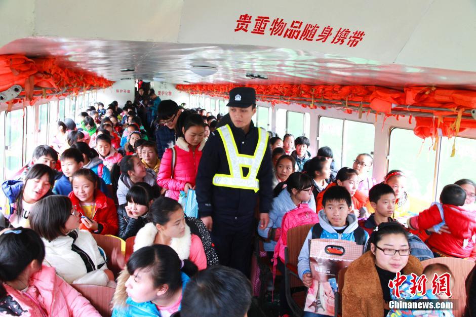 12月24日下午,湖北长阳土家族自治县渔峡口镇中心学校开始了今年秋季的第9次周假,初三学生李江龙收拾好书包和衣物后,高兴地走出了校门。李江龙将和其他350余名学生一起,在民警和老师的陪护下,从学校步行1.5公里到渔峡口客运码头,然后乘船过江回家。渔峡口镇地处山区,学生们回家走的都是山路,特别是从今年3月起,进出渔峡口镇的陆上通道“渔盐公路”封路施工,很多学生都要乘船过江,增添了不安全隐患。为让学生顺利回家,在渔峡口镇政府的组织下,海事部门调集了7艘客运船只,负责将学生运送到各个码头,然后学生分别在离家最近的渡口乘车回家。此外,学校也将放假时间进行了调整,实行两个星期放一次周假。“以前放假时还要担心坐不上车,不能及时到家,家里人也会很担心我们的安全。现在不同了,放假就像一场仪式,我们感受的不仅是安全,更是社会对我们的关心和爱护。”李江龙说。皮亚捷 摄