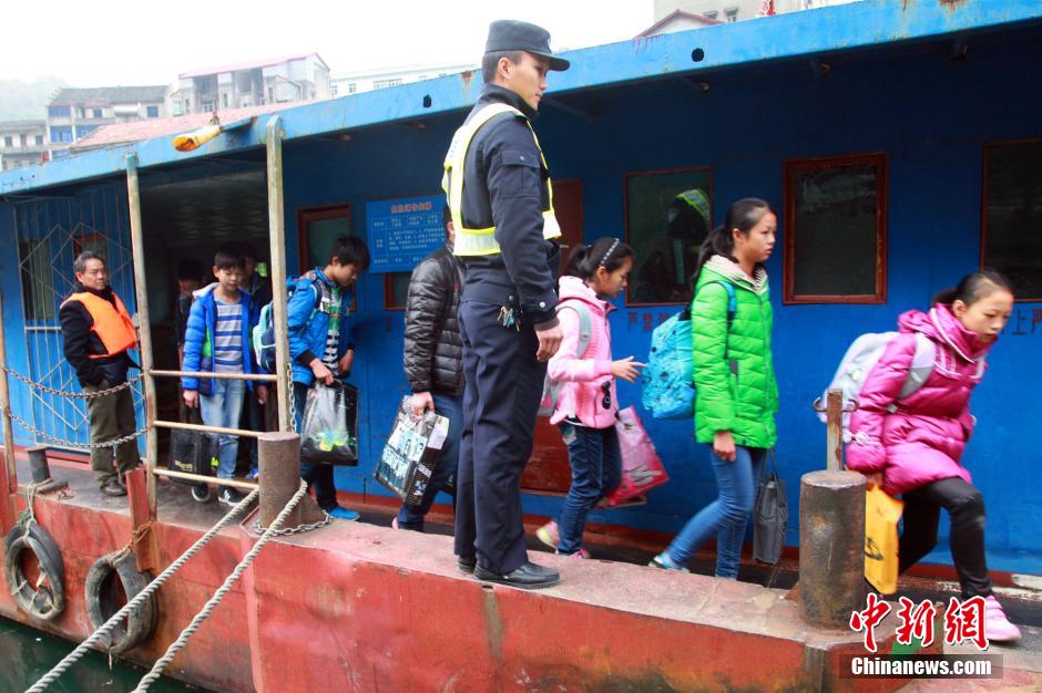 12月24日下午,湖北长阳土家族自治县渔峡口镇中心学校开始了今年秋季的第9次周假,初三学生李江龙收拾好书包和衣物后,高兴地走出了校门。李江龙将和其他350余名学生一起,在民警和老师的陪护下,从学校步行1.5公里到渔峡口客运码头,然后乘船过江回家。渔峡口镇地处山区,学生们回家走的都是山路,特别是从今年3月起,进出渔峡口镇的陆上通道“渔盐公路”封路施工,很多学生都要乘船过江,增添了不安全隐患。为让学生顺利回家,在渔峡口镇政府的组织下,海事部门调集了7艘客运船只,负责将学生运送到各个码头,然后学生分别在离家最近的渡口乘车回家。此外,学校也将放假时间进行了调整,实行两个星期放一次周假。“以前放假时还要担心坐不上车,不能及时到家,家里人也会很担心我们的安全。现在不同了,放假就像一场仪式,我们感受的不仅是安全,更是社会对我们的关心和爱护。”李江龙说。皮亚捷 摄