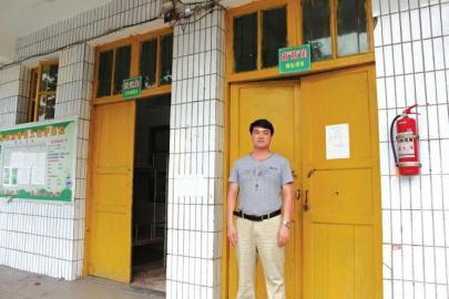 杨友周在自己寝室外留影 与学生同起居