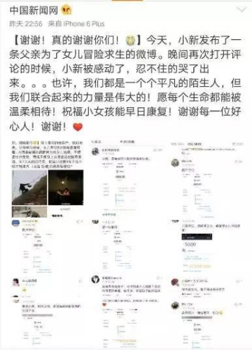 当天晚上,小新看到微博上有那么多善良的网友被感动得热泪盈眶,于是特意发了一条微博感谢善良的网友们。 小新负责值班的同事激动地写下了这段文字:下班后,在地铁里点开"蜘蛛侠"爸爸小女孩的微博评论,瞬间被一个个热心网友的转账截图感动了,突然觉得自己的工作是那么的有意义!我们的每一个网友都是有血有肉有爱心的,愿每个生命都可以被温柔相待,北京的初冬很冷,但是心却是暖的…… 此外,除了网友转账,还有不少好友将爱心善款转至前方记者的手中,希望代为转交给高新民一家。 著名演员李小璐也委托工作人员与小新取得联系,希望以微薄之力来帮助这个可怜的女孩。 高新民告诉记者,从昨天(9日)下午到今天上午,家里陆陆续续来了好几拨人,提着米面油和孩子的生活用品。 …… 19万善款到账,孩子治病有了希望 此前,小新在微博的评论中看到这样一条消息: 其实,前段时间在网上传出的《我们好心捐出的旧衣服去哪儿了?看完我怒了!》确实让人们对公益活动产生了顾虑,但是小新的这次倡议给小女孩早日做手术带来了希望——高新民的账户上已经筹得了19万元善款。 高新民向前方的记者介绍,今天(10日)早上,高新民骑着小摩托行驶了40多公里到达临近的农行网点,在银行安保人员的帮助下,查询到卡内金额为19万元。 高新民对小新的同事说,非常感谢每一位好心人的帮助,他将尽快到省会太原为女儿治病。同时,因为之前家庭贫困,8岁的大女儿一直有流鼻血的症状。高新民希望在给小女儿治好病后,也给大女儿做一下检查,当务之急是让两个孩子健康的成长。 这就是爱心的力量,一个人的爱心微不足道,一群人的爱心就能拯救一个家庭。 小新真心感谢每一位伸出援手的网友,让这位“蜘蛛人”爸爸不再冒着生命危险捡酸枣,也让小女孩的病早点得到治疗。小新还将持续跟踪报道小女孩的治疗情况,期待早日为大家带来女孩康复的消息!