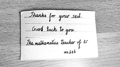 “给一位老爷爷让了座,不仅得到一张感谢卡,还被辅导了一下高数课,真是赠人玫瑰,手留余香。”11月21日,武汉科技大学的大一新生王迪在朋友圈里贴出这张英文手写的感谢卡。 这张感谢卡是用包装盒纸做的,英语写得很美,大意是“感谢你让座,祝你好运!”落款是“一位85岁的数学老师”。卡上还编了号,王迪拿到的是第626号。 王迪回忆道,上周末,她和七八个同学乘坐539路公交车,途经武昌火车站时,一位白发苍苍的老人走上车。车上很拥挤,她坐在车门旁边,立即起身让座。老人微笑着对她说:“谢谢你,好孩子!”并摸索着从口袋中掏出一张卡片给她,“不不不,给您让座是应该的。”她随后接过一看,原来是感谢卡。 老爷爷跟王迪他们聊天。他以前在大学教高数,就帮忙讲解了他们正在学的“中值定理”,一下就把她不会的地方讲明白,快讲到“泰勒定理”时,很遗憾他们要下车。 王迪的同学好奇地问:“爷爷,您这数字编号是什么意思呀?”老人说,从7年前开始,他每次出行前都会带上两张自制的感谢小卡片,在往返的途中,如果有人在公交车上让座,便赠送给对方。这些年来,让座的时候还是多数,“希望你们收到卡片感到快乐,更加乐意去做善举!”