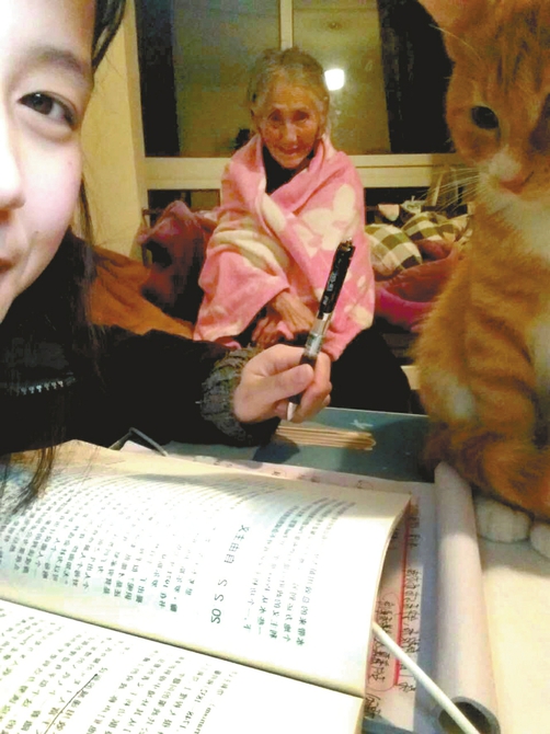 刘琳一边上学,一边照顾着93岁的奶奶。 刘琳经常拿起手机和奶奶玩自拍。(刘琳自拍照) 打开《全民K歌》APP的个人账号,一首甜美欢快的歌曲正是刘琳唱的,刘琳重复着她的口头禅:“哎,好尴尬啊。”主页上,闪耀着点赞好友的一张张大头照。可是,这些20岁女生本该拥有的阳光般灿烂的青春时光,对成都大学张澜学院大二女生刘琳来说,有点奢侈,因为2016年,20岁的她经历了人生最沉重的打击——父亲病故、母亲摔伤,自己93岁的奶奶也摔骨折了……后来,刘琳做了一个选择:把高龄的奶奶从四川资中的山村接到成都,在学校里租下一间小屋,一边上学,一边照顾奶奶。 刘琳 21岁,女,四川资中人,成都大学张澜学院大二女生。2016年,刘琳的父亲病逝、母亲摔伤,93岁的奶奶也意外摔倒骨折了,刘琳不得不将奶奶接到成都,在学校租了一间房子,一边上学,一边照顾奶奶。最近,刘琳带着奶奶上大学的故事在学校传开了,她的孝心感动了无数人。 变故 她错过父亲最后一面 1月6日上午,刘琳考完了《基础会计》,这是本学期最后一门考试,忙碌的学期总算结束了。她匆匆跑出教学楼,往租住地赶去。 刘琳轻轻推开门,朝里张望,奶奶正在睡觉,窝在奶奶怀里的猫竖起耳朵,一直看着她。这只猫叫“铛铛”,刘琳去学校上课的时候,就只有铛铛陪着奶奶。坐在床沿,看着睡梦中的奶奶,刘琳露出了微笑。 “这一学期,总算告一段落了。”刘琳有点如释重负的感觉。 刘琳的“忙碌”和别的同学完全不一样,除了学业,还因为自己的家庭。说到2016年夏天的事情,刚刚还挂着笑的刘琳眼圈发红,开始哽咽,把自己关进卫生间哭了一场。 刘琳的家在资中县球溪镇的一个山村。2015年,她以优异的成绩考入成都大学张谰学院,就读旅游与经济管理系财务管理专业。来到省城读大学,刘琳有了新的朋友,大一的生活是欢畅而轻松的。 没想到从2016年3月开始,刘琳家里接连发生意外,她的奶奶摔成左股骨粉碎骨折,母亲不久也摔骨折了。4月中旬,身体一直不好的父亲突然病情加重,离开了人世。父亲去世当天,刘琳正在上课,手机放在了宿舍里,结果没及时得到消息的她,错过父亲临终最后一面。这一切,给了刘琳极大的打击。 决定 一边上学,一边照顾奶奶 2016年暑假刚放,刘琳和弟弟就赶紧赶回老家。走进屋里,年迈的奶奶躺在床上,刚刚伤愈的母亲难以承受巨大的精神压力,照料自己都很吃力,家里弥漫着无助绝望的气息…… 刘琳的爷爷早已过世,父亲有兄弟三人,但如今都已过世,照料93岁的奶奶,成了刘琳姐弟俩面临的最迫切的问题。 刘琳正在大学读书,弟弟在成都超市打工,都不可能常回老家,谁来照顾奶奶呢? “没有办法的办法,家里已经没有人能照顾她了。我是奶奶带大的,现在应该我来照顾她。”于是,刘琳决定把奶奶带到了成都,一边读书,一边照顾奶奶。 2016年8月3日,刘琳和弟弟、表弟租了一辆车,载上奶奶的轮椅、棉被行李,直奔成都。大热天,她又在校园公寓里租下一间单间,添置了些生活用品,安顿了下来。弟弟则继续在红牌楼的一家超市打工挣钱,维持这个新家的运转。