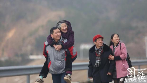 老胡的母亲有听力和语言障碍,父亲在智力上也有缺陷。胡汉权还有一个哥哥和一个妹妹,都在县城打工。平时老胡不给父母钱,是因为二老不认识钱,也不会花钱。他给妹妹留下一张银行卡,用来给父母购置生活用品。回家的第一顿早餐,是母亲煮的清汤鸡蛋面。只有三个人吃饭,母亲却一口气往锅里打了六个蛋。推推搡搡间,母亲非要把鸡蛋夹到老胡的碗里。简陋的家里,四间小屋,一张桌子,几个板凳。没有什么像样的家具,几个土鸡蛋就是母亲觉得最好的东西。儿子在一天天长大,父母也在一天天变老。每次回来,老胡都会尽自己所能帮家里多做些农活。 杀年猪、打糍粑、炖火锅……19年没有回家过年,老胡已记不清家乡的年夜饭是什么味道了。得知他回来,家里的亲戚全都赶来聚在一起,特意为他准备了一桌团年饭。英山县有很多水库,老胡家门前也有一个。第二天一早,老胡和妹妹背上母亲、带上父亲到周边最大的张家咀水库去散步。 能够背着母亲的旅行,是让老胡感到最幸福的事。四年前,老胡和爱人第一次带着父母去武汉买东西,两位老人特别高兴。而那次经历之后,老胡和家人就做了一个大胆的决定,利用每年的假期,带着将近70岁的父母到全国各地去旅行。