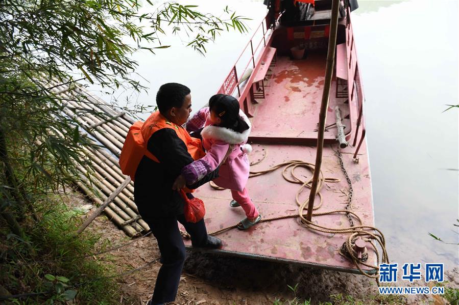 倪华成在广西岑溪市波塘镇杨亦村黄华河边将学生抱上渡船(2月27日摄)。 3月1日是广西岑溪市波塘镇杨亦小学教师倪华成正式退休的日子。这位摆渡送学40年的老教师称,退休后,他还会继续为孩子们摆渡送学。 1977年,20岁的倪华成高中毕业后来到杨亦小学成为一名民办教师,从那时起,他同时也成了一名义务摆渡接送学生的渡工。杨亦村滩急组只有23户人家,却因为一条河与对岸的杨亦小学分隔开来。兴建桥梁耗资巨大,长期以来滩急组的孩子们要到对岸上小学,只能靠家长们撑竹排接送。在家长们的请求下,同样住在滩急组的倪华成承担了“顺带”孩子们上学的工作。就这样,小学教师倪华成早上送、晚上接,成了一名义务“摆渡人”。每年倪华成都在家长的帮助下用上好的竹子重新扎一条竹排。到2008年政府购置铁壳渡船之前,倪华成已用过31条竹排,接送的学生自己也不知道有多少,但没有出过一起安全事故。换了渡船后,倪华成肩负起更多安全责任,接送学生至今。加上之前用竹排接送,时间一晃就是整整40年。最后一次课后,全校师生在校门口合了个影,倪华成感到一些轻松,但他还有牵挂:到下学期滩急组还有4个小孩要过河上学,学生家长也担心他退休后,孩子上学可能没人接送。 “我有渡工证,只要我还干得动,我都会继续为大家摆渡,我感觉我的身体能干到70岁!”倪华成挥挥手,语气铿锵,仿佛又回到了当年撑竹排护送学生过河的模样。新华社记者 周华 摄
