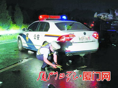 满载活鱼的车辆在高速路上侧翻,民警帮着捡鱼。 本报讯(文/图 记者 黄璜 通讯员 魏柯)5月3日晚上,沈海高速漳州往厦门方向的海沧路段,一辆满载活鱼的货车侧翻,落在地上的活鱼四处蹦跶,过往车辆躲避不及,纷纷刹车。厦门高速交警支队民警迅速赶到展开布控、疏导并清理现场。 当时,这辆货车突然爆胎,车辆侧翻,倒在第二车道上,一车的活鱼全部落在路面上,几乎铺满了事发地的四条车道,成千上万条活鱼在车道上活蹦乱跳。过往司机为了避免压到鱼,纷纷减速,影响了通行效率,也加大了追尾的风险。高速交警赶到现场后,一边进行安全布控,指挥过往车辆有序通行,并及时对事故现场进行拍照取证。另一组民警则负责组织协调现场施救,及时清理路面上的活鱼。此时的交警已经化身“捕鱼达人”,与现场施救人员一起,经过半小时的努力,把路面上大部分的鱼都抢救了回来。 高速交警在此提示广大驾驶员,在高速公路行驶时,车子一旦爆胎,切不可紧急刹车,要握住方向盘,慢慢把车速降下来,平时要注意轮胎的保养,养成检查胎压的好习惯,避免因爆胎发生事故。