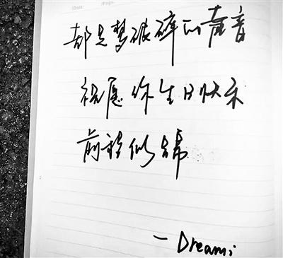 20岁的生日对很多人来说都是需要隆重庆祝一下的,吃个生日蛋糕,叫上几个朋友去唱歌,或者给自己买一份喜欢的礼物。不过大一女生杨冰倩,在自己生日的这一天却选择了一种独特的庆祝方式——在校园内摆无人看守的地摊,请陌生人写下“人生忠告”。一天的时间里,她收获了将近300条留言。 杨冰倩是四川外国语大学成都学院大一的学生,今年的5月24日,是她20岁的生日,往年过生日,家人都会为她多做几个菜,买一个生日蛋糕庆祝一下,但是今年的生日,在外求学的她只能选择其他的庆祝方式了。 “周围经常有同学过生日,无非就是吃一顿大餐,出去唱个歌什么的,我觉得这样的庆祝方式太普通,20岁的生日是很特别的,代表了真正地长大,所以我想用特殊的方式来纪念,于是就想出了摆摊让陌生人写‘人生忠告’的方式。”杨冰倩告诉北京青年报记者。 生日前几天,她着手准备了笔记本和小桌子等工具,因为是无人看守的地摊,她还在一张纸板上写明了自己诉求,生日当天便摆在了学校宿舍楼楼下,没想到,这个摊位很快便吸引了很多人,大家纷纷在杨冰倩准备的笔记本上留言。 北青报记者看到,杨冰倩在摊位上准备的纸板上写着:“嗨,陌生人!今天是我20岁生日,我将买生日蛋糕的钱换成硬币,愿意送你一块‘蛋糕’,但作为交换,你必须送我一条关于20岁的忠告或者一个你的故事,并保证绝对真实。写在旁边的本子上吧!” “我开始的时候想买一些生日蛋糕摆在那里,凡是写留言的同学,都可以分一块蛋糕,就当给我过生日了,但是后来考虑到卫生等原因,就把蛋糕换成了硬币,写完留言的人可以带走硬币,就当是吃了我的生日蛋糕了。”杨冰倩说,硬币是她从学校后面的小吃一条街换的,一共准备了40多个,但是大多数写完留言留下祝福的人都没有拿走硬币。 从早晨8点到晚上10点,杨冰倩一共收获了近300条留言,写满了整整五本笔记本。途中她还曾经偷偷去地摊旁边看了看情况,“完全没有想到会有这么多人留言,看到笔记本快被写完的时候,我就去买来新本子,再放到那里。” 在近300多条留言中,绝大多数都是写给杨冰倩的祝福和忠告,杨冰倩说,她仔仔细细看完了所有的留言,有些人会讲述一个很长的故事,说很多的感悟,也有的留言寥寥几句,但是真诚。 “每个人都有每个人的生活和世界,但是几个本子让我在生日当天和陌生人之间有了那么一点点交集,这样的交集让我觉得很温暖。”杨冰倩说。 杨冰倩的这一举动也被许多同学拍下来发到了微信朋友圈和微博里,很多网友对这样独特的生日表示了赞赏,同时也觉得收获了温暖,“我上大一的时候,班上每个人过生日我们班级所有人都会写小纸条祝福,那个时候不一定都熟悉,却被每一份祝福感动,看到她的这个行动,忍不住回去翻了一下留言本,这种来自陌生人的真诚祝福真的很感动。”一位网友说。 对话 杨冰倩:会好好珍藏这些留言 北青报:为什么会想到用摆摊求陌生人“忠告”这样的方式来给自己作为生日礼物? 杨冰倩:之前看过一本书,上面写着国外有的街头艺人会给路人硬币,但是路人需要给这些街头艺人讲一个故事,我觉得这个想法挺好的,就想用类似的方式来给自己也过一个生日,看看会收到什么样的祝福和人生忠告。 北青报:会想到有这么多人留言么? 杨冰倩:开始的时候我准备了两个本子两支笔,还有一些硬币,分别放在了宿舍楼下的两个地方,最开始特别担心会没有人来给我写留言的,所以还提前和好多朋友说好了,如果最后没有人写,就让我的好朋友帮我写。结果摊子摆到那里之后,我偷偷地去看过几眼,结果发现好多人都在围观,好多人在写,这大大出乎了我的意料。 北青报:有想过成为了“网红”吗? 杨冰倩:后来有同学把我的摊子拍下来发到了网上,好多人说我成了“网红”,这些是让我完全没有想到,我的初衷其实只是想给自己过一个特别的生日。之前有一个患有抑郁症休学的朋友在微信里看到了我的消息,通过别的同学给我订了一个蛋糕,让我分给那些给我留言的同学,他说这件事让他也很温暖,其实我真的希望我的行为不仅可以温暖我自己,也可以温暖到更多的人。 北青报:收获了哪些让你印象深刻的祝福和故事? 杨冰倩:留言有很多,我最后全都看完了,很多内容是我想要自己珍藏的故事,不过有几句话让我特别难忘,比如有一条留言说,“愿你永远年轻,永远热泪盈眶”,还有人说“祝你以梦为马,随处可栖”。还有一个今年毕业的师姐,给我讲述了她曾经遭遇的一些不幸,包括遭遇的困境、不公平的待遇等等,但是她写道,自己后来通过努力学习了口译,毕业后也找到了很好的工作,她告诉我说做什么事情都要坚持,都要有毅力。 北青报:未来会怎样保存这些留言呢? 杨冰倩:肯定会好好珍藏这几本笔记本的,当我人生可能遇到不如意的时候,我或许会拿出来看看,里面的温暖的话足以让我对未来充满希望。
