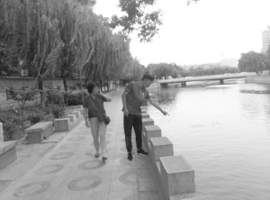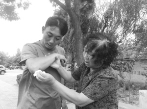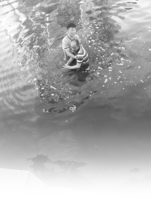 ■妈妈心疼地为他擦拭伤口。 ■救人者朱青云比划当时水深情况。 ■当时轻生者从这里跳下。 ■朱青云救人瞬间。李怀建 摄 “激动叔”一气下河 “馄饨哥”一举救人 朱青云是名不会水的饭店厨师,兼职卖馄饨养家,做好事并非第一次 清晨,一对中年夫妻遛弯时,男子情绪激动,跳入民心河自尽。危急关头,在附近早市上摆摊卖馄饨的小伙子,根本没想自己是“旱鸭子”,奋不顾身纵身跳入河里,勇救轻生者。岸边,卖西瓜的、卖煎饼果子的、遛狗的群众,大家齐出手,将轻生者拉上岸。事后,跳河救人的小伙子,却穿着湿漉漉的衣服悄悄离开……6月3日早晨8时许,这感人的一幕发生在,省会桥西区自强路与长青路交会处的民心河东侧。昨日,记者终于找到了这位救人好汉! □文/图 本报记者 董世杰 还原 挣脱媳妇手纵身跳下河 昨日下午,记者赶到出事地点,桥西区自强路与长青路交会处。碧绿的民心河水由南向北穿桥而过,水位最深处是河中央,河水呈墨绿色,长长的水草在河里随波荡漾。 这个时段,没有早市上的喧闹,河岸两侧,十分安静,偶有三三两两的散步者从此经过,都是悠然自得的样子。在桥头,记者见到了下河救人者的妈妈袁女士。说起儿子朱青云救人的事,头发花白的袁妈妈一个劲地抹眼泪。“我是事后才知道儿子下河救人的,关键是他不会游泳,想想我都后怕……”65岁的袁妈妈指着河水说。 袁妈妈说,儿子朱青云今年37岁,是两个孩子的父亲。工作之余为了贴补家用,他每天凌晨4点起床和家人在桥头摆摊卖馄饨。6月3日早晨,象往常一样,朱青云刚刚煮了一锅馄饨,就发生有人跳河轻生的事儿。袁妈妈说:“早上八点的时候,一个中年汉子跳了河,当时桥上有许多人,就是没人敢下去救,眼看那人快走到民心河中间了,是我儿子纵身跳下河,把他给救了回来。我儿子不会水,后来我问,你也不会水怎么敢下去啊?他说,再怎么着也不能眼看着人被淹死啊。我儿子是河北中国大酒店的职工,有这样的儿子我感觉特别自豪。” 见到救人者朱青云时,他正准备去酒店上班。说起当天救人的事儿,身高一米八的他一脸不好意思:“这是我该做的!”,他说,在桥头早市上卖馄饨已经好多年了,当时,听见小摊南侧传来一个女人的哭喊声:“快来救人啊,有人跳河了!”。抬眼看去,只见河里有一个谢了顶的中年男人正往河中央走,太危险了。当时,早市上的人很多,许多人站在桥下围观,有人在照相,有人在喊话,可是没有人敢下去。朱青云说,这个情况,他扔下炊具就往河边跑,媳妇一把拉住她:“干吗去?你可不会游泳!”“那也不能眼睁睁地看着人被淹死啊!”说完话,他挣脱媳妇的手紧走几步,纵身跳下河。 众人齐出手场面感人 朱青云说,清晨的河水冰凉,河底的淤泥几乎没过小腿,每往前走一步都很困难。“大叔,别想不开,快回来!”他一边往前走,一边喊话,可是中年男人情绪激动,根本不听。如果再往河中间走,就会有生命危险,因为河中央水深可达两米。岸上卖西瓜的师傅递下来木头杆子,希望轻生者抓住,把他拉回来。但是轻生者执意要走不归路,一味往前走,河水已没过他的胸口。危急关头,朱青云不顾一切往前趟,脚下几乎滑倒,但最终还是抓住了中年男人的胳膊,使劲把他往回拉,然后紧紧抱在怀里。 中年男人还想挣扎,身强力壮的朱青云把他扛在肩上踱回了岸边。在附近卖煎饼果子的苏志国伸出了手;66岁的李怀建师傅正在修车,看到眼前一幕,也加入救人队伍;正在吃馄饨的55岁的李更生师傅扔下碗也跑过来了,他一边参与救人,一边报了警。朱青云在岸边的水中,双手将轻生者托举到头顶,岸上大家七手八脚把他拉了上来。河岸很高,朱青云在水里想爬上来,试了几次都没能成功。正好有一位遛狗的女士经过这里,她急中生智,解开拴狗绳递给水中的朱青云。大家一起用力,将朱青云拉了上来。负责这一片早市的维明街城管中队的闫先生告诉记者,当时场面特别感人。上了岸的朱青云浑身是泥水,右边的胳膊肘擦破了破,鲜血直流。 大家都不知道他叫什么名字,只知道他是卖馄饨的小贩,许多人冲他竖起了大拇指。 就在人们围着跳河者劝解时,朱青云穿着湿漉漉的衣服悄悄地离开了。随后,110、120都赶到了,经现场检查,跳河者没有受伤,后被120救护车拉走了。