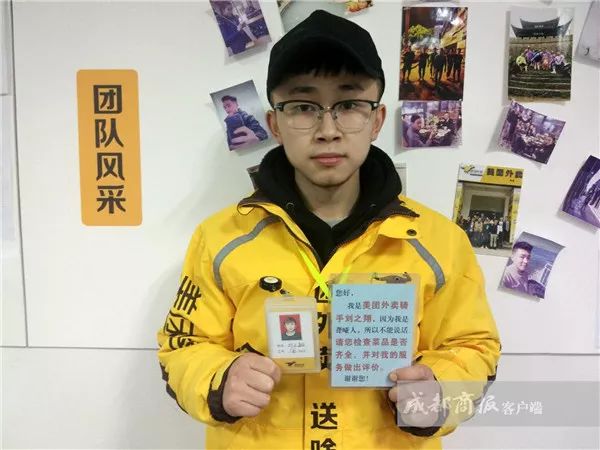 随后,记者联系上餐馆老板,对方表示对这个差评有印象,自己也确实向该外卖平台投诉过,担心影响自己生意。 “他说得好吓人嘛,还提醒单身女士。”老板说,最近一段时间,确实有一个聋哑的外卖骑手来取过几次餐,每次都是出示下手机上的订单,取了餐就走了。“是多老实一个人。”老板说。 真相让人泪奔 出示工作牌并非乞讨 外卖小哥乞讨要钱,难道不怕被投诉丢掉工作?记者联系上这位聋哑外卖送餐员刘之翔,得到的真相却让人泪奔…… 1月3日晚上这份单,22岁的刘之翔取餐、送餐整个过程不过10多分钟。但他没有想到,这份普通的外卖,竟然让他被戴上了“要钱”的帽子。 刘之翔通过手机打字,告诉记者,他记得那是晚饭时间,他将外卖送给客人后,将挂在胸前的工作牌递给客人,但对方连工作牌上的字都没有看,就挥手让自己走。 “他们以为我的工作牌就是要(他们献)爱心。”
