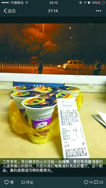入夜后的冬日,寒气逼人。1月17日晚上,浙江永嘉特警三桥岗亭里的四位执勤人员,心里却暖得“快哭了”:开车经过的陌生人偷偷点了份外卖,让外卖小哥给特警送来六杯热气腾腾的奶茶……“我们当时在执勤,看到一个外卖小哥把车子开到警亭旁边,一开始我们以为他是过来问路的,他却说自己是来送外卖的。”回忆起那晚的事情,从警7年的特警周琮钞说,自己暖得“快哭了”。外卖小哥送来了六杯奶茶,可周琮钞有点摸不着头脑,不可能有人在执勤期间点外卖啊。小哥说,这是有人特意点给你们的,然后放下奶茶就走了。周琮钞看了看外卖订单上的备注,写着“送给三桥收费站执勤的特警,别无他意,感谢特警们带给我们的和谐安全社会。”这陌生人送来的暖心慰问,让四个铁骨铮铮的汉子差点掉出泪来,直言“被感动了一把”。 周琮钞说,自己值守的三桥岗亭,是警灯工程的一部分,寒来暑往,他已经在这个岗亭里值守了四五年,抓过逃犯、捕过隐君子、拦截过赃车、追踪过小偷。他们习惯了执法时的“铁石心肠”,习惯了严阵以待,却从未想过自己在执勤时被陌生人暖到。周琮钞说,他和队员们站在寒冬长夜的朔风里,整个身子都是暖暖的,当晚他还发朋友圈说:“工作多年,早已麻木的心又泛起一丝暖意,竟也有未曾谋面的人送来暖心的慰问,只因为我们每晚亮起的警灯……” 好心人“只想表达下心意” 记者联系到送暖心奶茶的余先生时,他十分不好意思地说,这些只是自己的小小心意。27岁的余先生是安徽人,现在是永嘉一家鞋厂的老板。余先生说,三桥岗亭是瓯北通往市区的必经之路,“这几年每次去温州市区,都能看到特警在那里执勤,心里特别有安全感。” 余先生说,那晚他开车去瓯海区的鞋底厂运鞋底,“我五六点开车过去的,回来已经八点半了,看到特警还顶着严寒站岗执勤。”余先生说,天有些冷,自己想着让特警也暖和一点,所以回到鞋厂后就在网上下了单。细心的他特意点了热奶茶,还选择了不同的口味。 “他们在为我们的安全付出努力,我们应该感谢他们。”余先生说,自己只是想表达一点心意。 周琮钞说:“执勤都有值班纪律,为了保持形象和效率,所有人不能点外卖,除了喝水,其他饮料都不能喝。”周琮钞说,他们下班后才喝完了奶茶。他表示,“这份心意,让我们付出的一切都值得了。” 综合人民日报 钱江晚报