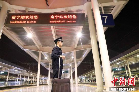 孔令扬是南宁铁路公安处乘警支队一名普通的乘警,今年28岁,家在山东济南,父亲曾是一名铁路警察。平时,这名年轻的“90”后铁警,不停地来往于南宁和济南之间,与妻子和父母过着聚少离多的“双城”生活,每月只有6个晚上在家。 今年大年三十和初一正好是他值班,大年三十晚上20时40分,孔令扬值乘的G434次高铁列车才到达济南西站,孔令扬赶紧赶回家与父母团聚。2月16日(年初一)早上6时,他即从家里出发,赶到济南西站,值乘上午8时15分由济南西开往南宁东的G433次列车。孔令扬只能和父母相聚不到8个小时,没来得及和妻子一起去岳母娘家省亲。 孔令扬只是南宁铁路公安处大年夜值乘民警中的一员,今年大年夜和年初一,南宁铁路公安处共有40多名民警坚守在岗位上。 万家灯火中,孔令扬从宿舍出发,赶往车站。 孔令扬在站台等待列车的到来。 孔令扬在列车上检查消防安全设施。 孔令扬在列车上帮助旅客检查行李物品。 孔令扬在车厢内检查旅客的身份证件。 返程列车站台上,孔令扬向家的方向敬礼告别。(胡宏 摄)