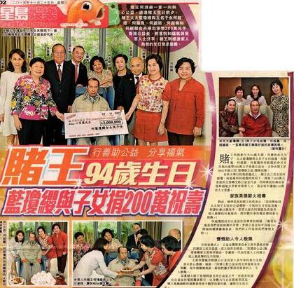 赌王何鸿燊今天94岁大寿,为庆祝此大日子,太太蓝琼缨与五名子女何超琼、何超凤、何超蕸、何超仪和何猷龙于昨天合共捐出港币200万元予香港公益金,支持由赌王于2001年创立的“贺礼捐公益”筹募活动。