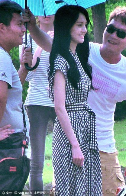 郑爽锥子脸铅笔腿依旧 穿格子裙片场休息心情好(组图)