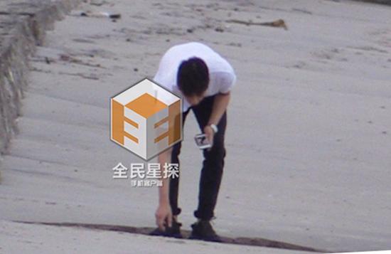李易峰竟独自来到沙滩边上写字。