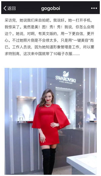 最近,米兰达·可儿现身中国,为某珠宝首饰品牌站台,她在接受时尚博主gogoboi采访时自曝爱用“美图秀秀”app,并表示用了会更自信。不过原本身材就完美的她就算修图,也只是用“一键美容”简单处理下就很美了。