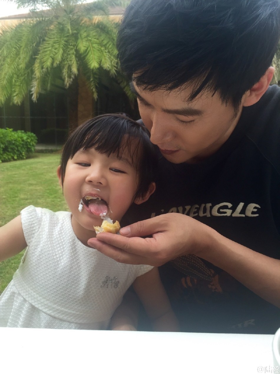 陆毅为小女儿贴心喂蛋糕 贝儿乖巧站旁边