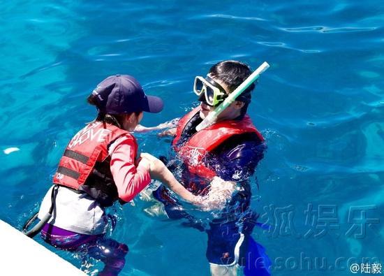 陆毅与两女儿海边嬉闹 迷你贝戴遮阳帽呆萌可爱(组图)