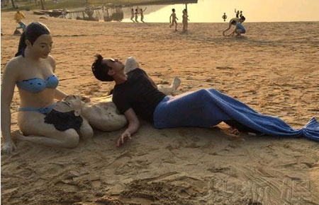 邓超躺沙滩变身美人鱼 身姿妖娆逗比范儿