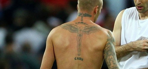 脖子后方,小贝的纹身是一个带翅膀的十字架,寓意受苦受难,方能提升。