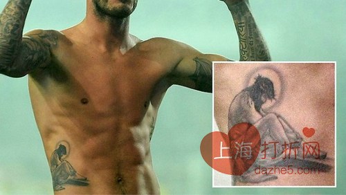 左胸上方是三个天使将耶稣从坟墓中拯救出来的大幅刺青,画面中的耶稣形象就是贝克汉姆本人,寓意自己的三个儿子对他的爱。