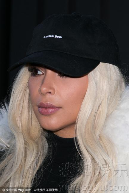 卡戴珊妆容精致,黑色棒球帽遮面。