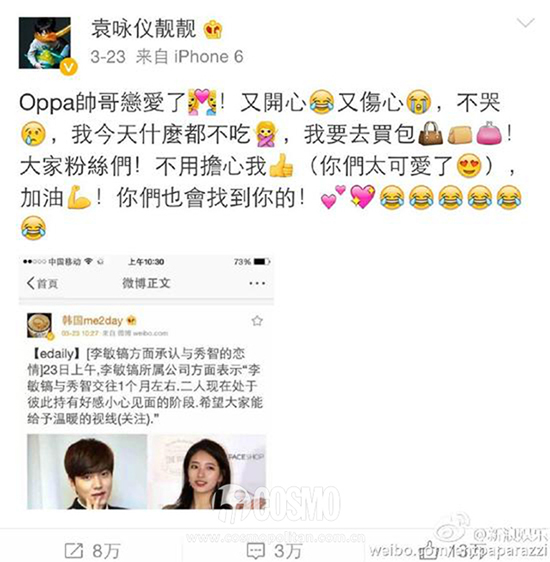 韩国媒体公布了韩国男星李敏镐与女团Miss A成员秀智在伦敦约会的照片,之后双方的经纪公司回应绯闻,承认两人已交往一个月,并希望广大粉丝能够支持祝福。消息曝光后,袁咏仪便在微博表达心情,自称“又开心,又伤心”,“我今天什么都不吃,我要去买包”。