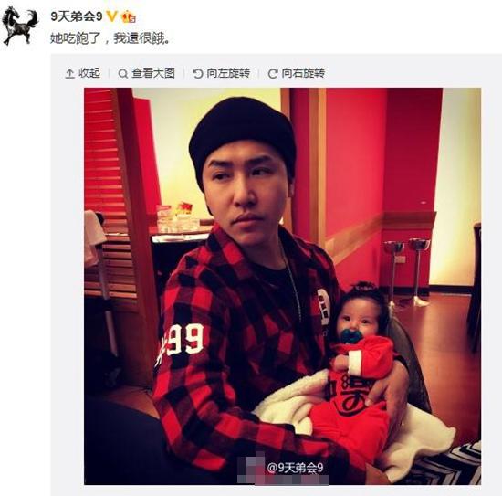 欧弟经纪人通过微博晒欧弟一家三口全家福。照片中,女儿躺在欧弟的怀里,乌黑的头发,粉嫩的小脸蛋。