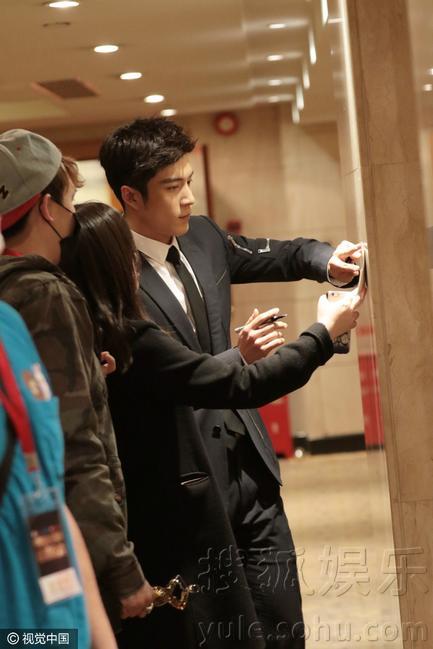 韩东君黑色西装帅气现身 贴墙壁认真给粉丝签名