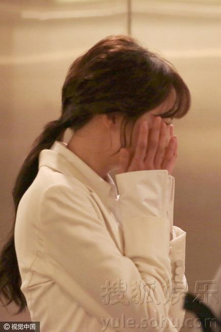 郑爽一身白色小西装,边走边摆弄着手机链。