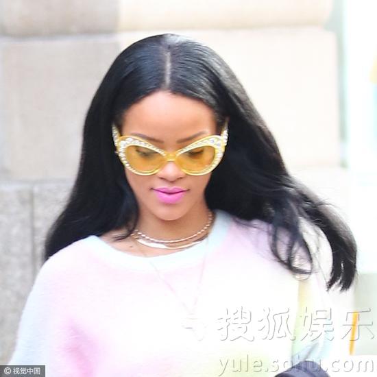 蕾哈娜淡彩虹色套装现身,颇有复活节气氛。